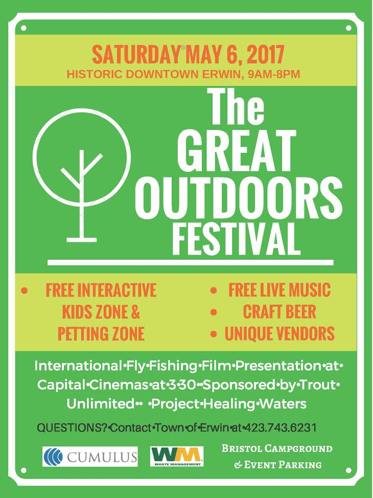 The Town of Erwin is proud to present The 2nd Annual Great Outdoors Festival on May 6 from 9 a.m.- 8 p.m. throughout downtown with free admission for the public. Please call Jamie Rice at 423-743-6231 for more details.