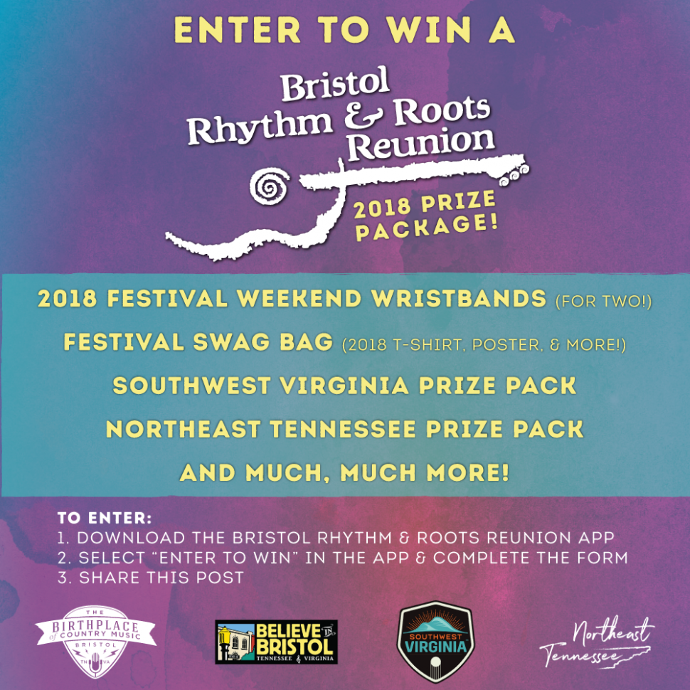 The Prize Pack includes two full weekend tickets to the 2018 Bristol Rhythm & Roots Reunion, accommodations during the festival, swag from Northeast Tennessee and Southwest Virginia and more.