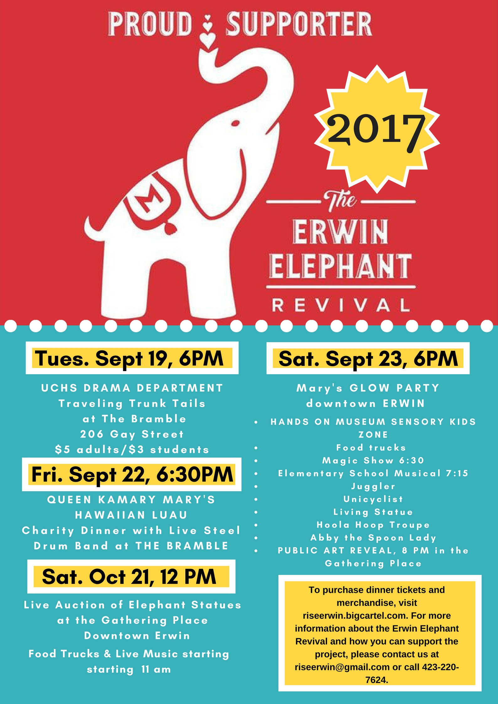 The Erwin Elephant Revival is back for year two! Join us Saturday, September 23rd in downtown Erwin for Mary’s Glow Party!