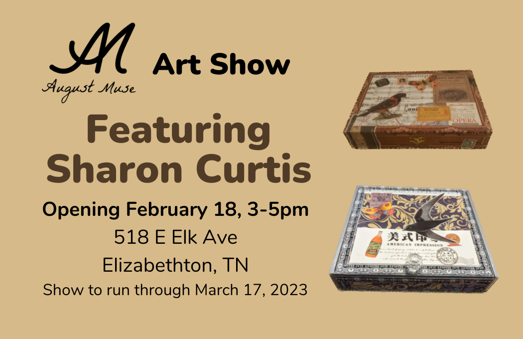Come in store to August Muse and help us welcome a new artist, Sharon Curtis, and view her collage art works. Curtis has spent the last 5 years honing her skills as a collage artist. Curtis claims no formal training in the arts. Curits was inspired by the work of an artist friend inspired her to believe that we all have art in us. “I saw her take old maps, photographs, and magazine cuttings and turn them into beautiful works of art without ever picking up a paintbrush. I thought, ‘I can do this!’” She creates useable art with her collages on old cigar boxes to create a beautiful place to hold keepsakes.
