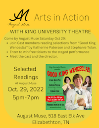 August Muse will host King University Theatre Cast Saturday, October 29, 5-7 pm downtown Elizabethton. Cast members will read selected scenes from the new play, “Good King Wenceslas” by Katherine Paterson and Stephanie Tolan. Enter to win free tickets to the staged performance December 1-3 at the Paramount Center for the Arts in Bristol. Meet the cast and the director.