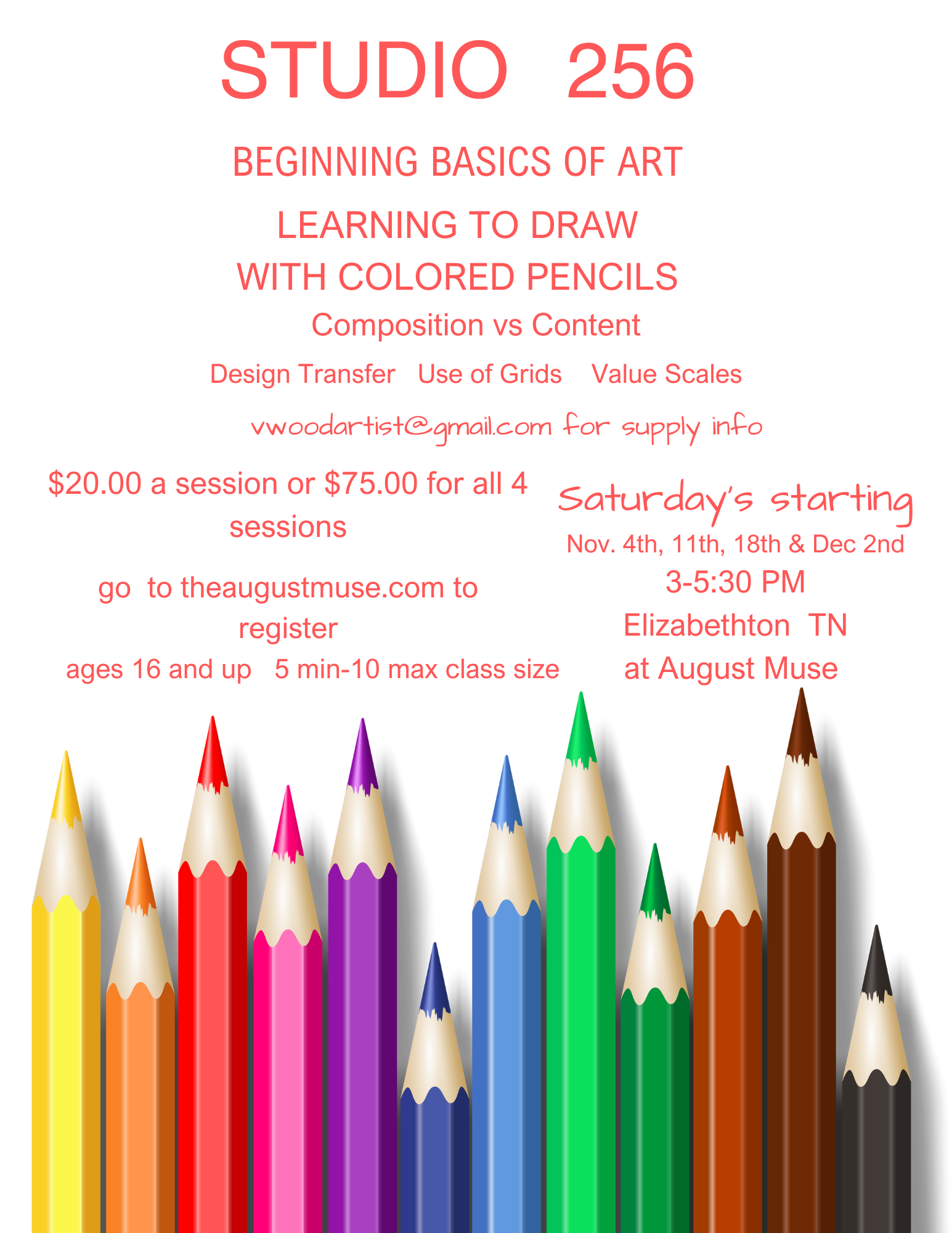 Learn through using colored pencils the art of drawing including design transfer, the use of grids, value grids, and composiiton vs. content. This class is for those ages 16 and up. The first three sessions will be mostly teaching concepts while the fourth session will conclude with a final project with a cardinal just in time for winter! Most of the materials are included with the cost of the sessions, contact Vicki: vwoodartist@gmail.com for further supply information.