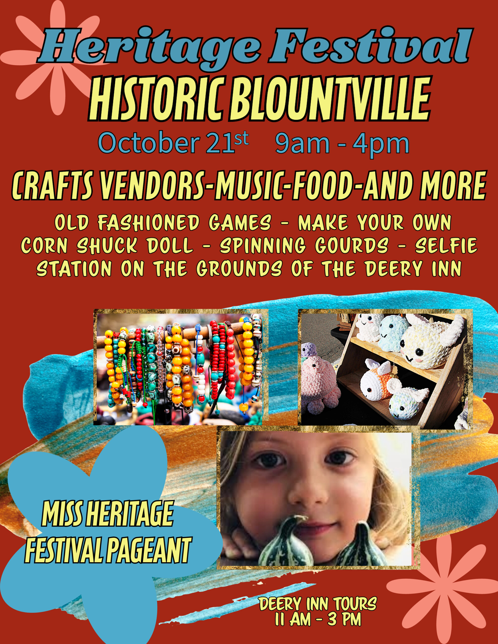 Historic Blountville is set to hold the annual Heritage Festival. There will be craft vendors, food vendors, music, games, Miss Heritage Festival pageant, Deery Inn museum tours and more. Join us on Saturday October 21, from 9 am – 4 pm.