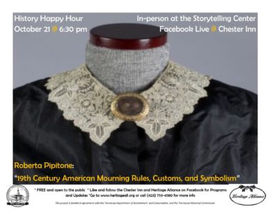 This project is funded under an agreement with the Tennessee Department of Environment and Conservation, Tennessee Historical Commission. For more information on the Chester Inn Museum, History Happy Hour, or the Heritage Alliance please call our office at 423.753.9580 or the Chester Inn Museum at 423.753.4580. You can also contact the organization via email at info@heritageall.org. Additional information about the Heritage Alliance and its mission can be found online at http://www.heritageall.org/. Be sure to follow the Chester Inn and Heritage Alliance Facebook pages for updates about events at the Chester Inn and other Heritage Alliance programs.
