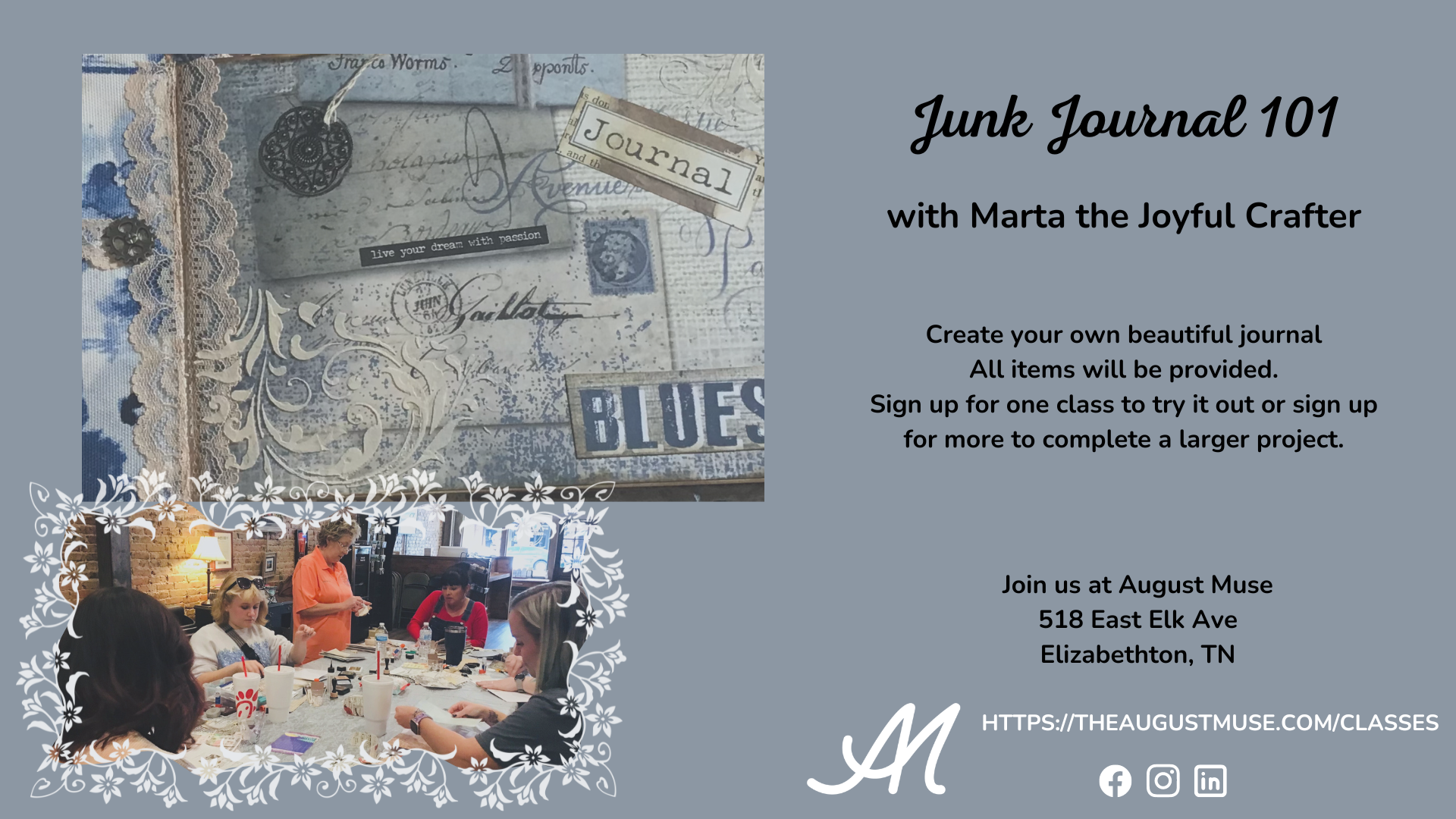 Come in from the heat and create Junk Journal using beautiful papers, fabrics and embellishments. Join Marta, the joyful crafter, at August Muse July 14 from 12-2pm.