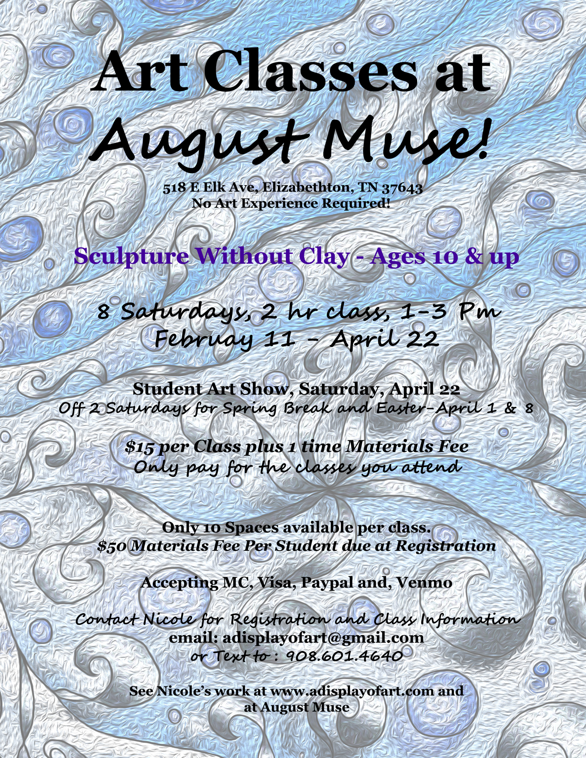 Learn more and register for classes by email: adisplayofart@gmail.com