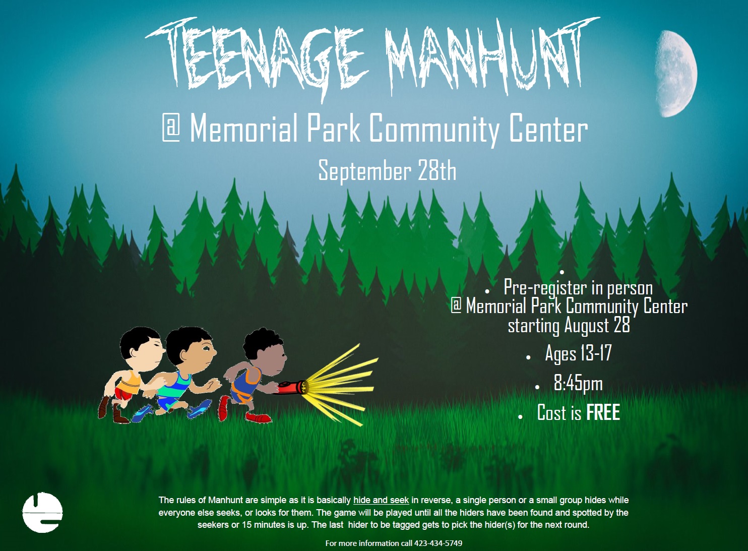 Teens bring your friends out for a fun game of Manhunt. The rules are simple – it’s basically hide and seek in reverse. A single person or a small group hides while everyone else seeks, or looks for them. The game will be played until all the hiders have been found and spotted by the seekers or 15 minutes is up. The last hider to be tagged gets to pick the hider(s) for the next round. Please bring your own flashlight.
