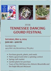 May 4th – Sullivan County Historical Preservation Association is hosting, The 1st annual Tennessee Dancing Gourd Festival the event will be held on the grounds of the Old Deery Inn May 4 from 9:00 am until 4:00 pm. There will be “dancing gourd” contests, gourds to paint and gourds and seeds to buy. There will be tours of Historic Blountville which will include peeks into some of the privately owned buildings not normally open to the public. Additionally there will be a Craft Fair sponsored by the Friends of the Blountville Library at the Blountville United Methodist Church, booths of garden plants and hanging baskets, and food from Baked and Loaded Food Truck. At 5:30 pm S.R.S Paranormal will offer ghost story readings and a public investigation of the Old Deery Inn