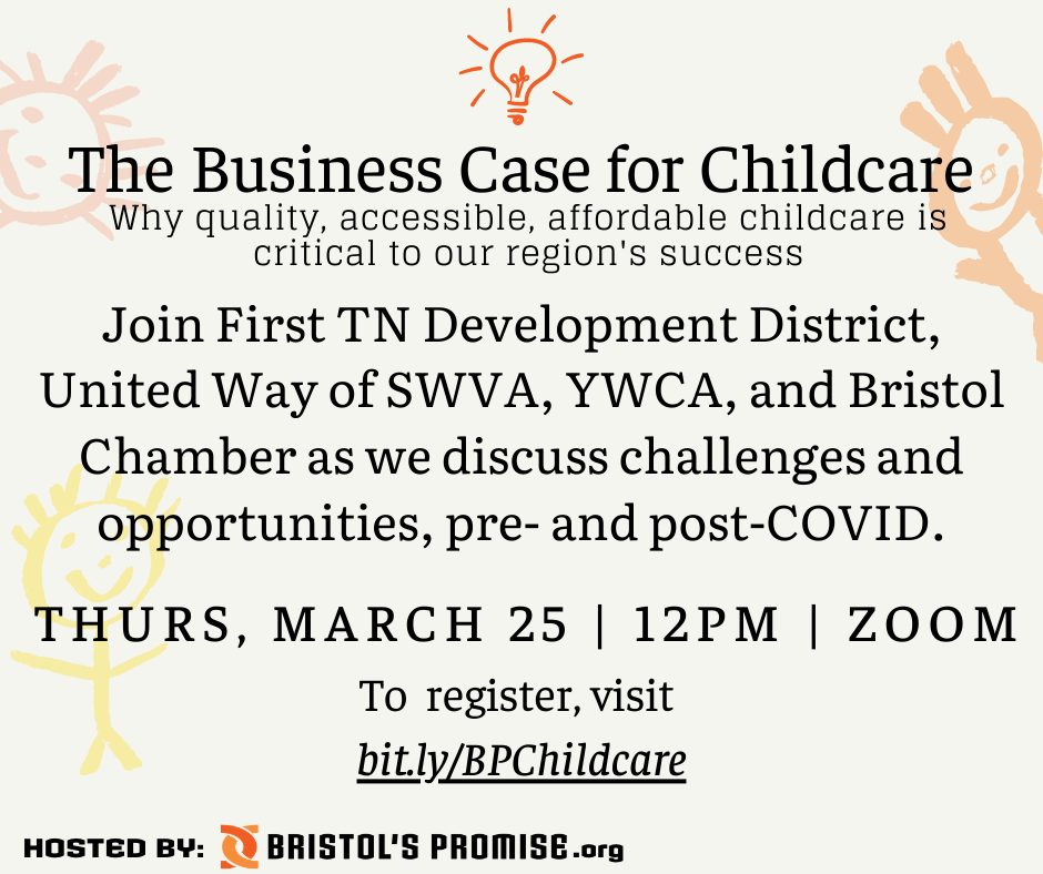 Join us for a panel discussion on “The Business Case for Childcare; why quality, accessible, affordable childcare is critical for our region’s success” We’ll discuss challenges and opportunities, pre- and post-COVID. Guest speakers include Beth Rhinehart, Bristol Chamber of Commerce CEO;