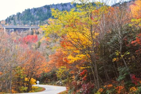 The Roan Highlands are a leaf viewer’s paradise. There is simply no place like Roan, and the panoramic views of the surrounding colorful mountains is like nothing you’ve ever seen. Catch peak views up here a little sooner than the lower elevations and bring a jacket, as it’s usually 10 degrees colder and windy. There are a few pull-offs along the drive to stop and take in the views and the ever popular hike along the balds to Grassy Ridge.
