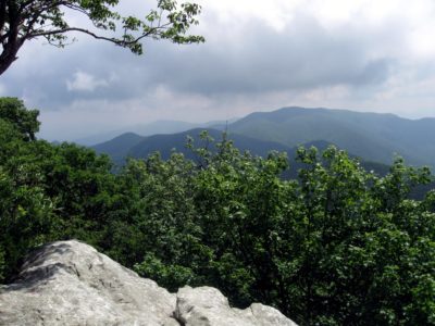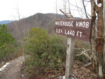 Switchbacks lead you to the top of Whitehouse Cliffs, reaching the top at one mile. Mountain vistas take over the horizon, and you can look directly up the vale of Rocky Fork to Coldspring Mountain and the Tennessee-North Carolina state line. To the northwest, Buzzard Rock stands white, Rich Mountain defines the drainage of Rocky Fork, and the anvil shape of Flint Mountain rises proudly across the Fork. To the southeast, the length of I-26 stands out, and you can see where it hits North Carolina at Sams Gap. The grassy ridge of Big Bald can be seen from across the interstate. To the northeast, the dark mantle of Unaka Mountain stands.
