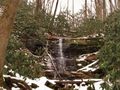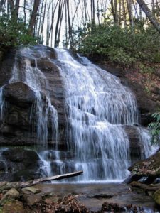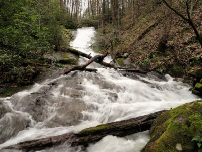 The 1.8 mile round-trip to this 100-foot spiller is rarely visited. Take the Jerry Miller trailhead just past the Tennessee state line in North Carolina, cruising over a hill where white trilliums bloom by the thousands in spring. At the .9 mile marker, as Whiteoak Flats Branch and the trail finally come together, you’ll see the 100 foot Whiteoak Flats Cascade. Despite its length and opulence, no beaten trail to it exists, but the cataract isn’t difficult to photograph if you are willing to work for it.