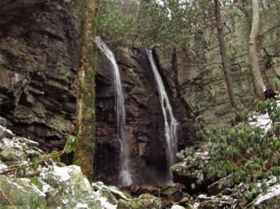 Make the 3.8-mile round-trip from Horse Creek Recreation Area near Greeneville to a four-wheel drive accessible road in Horse Creek, part of the greater Bald Mountains trail system. Trek up Horse Creek Valley, hopping the stream a few times before joining Poplar Cove Trail to pick up Petes Branch Trail, passing an abandoned homestead. At higher flows, you’ll see two distinct waterfall ribbons making Petes Branch Falls.