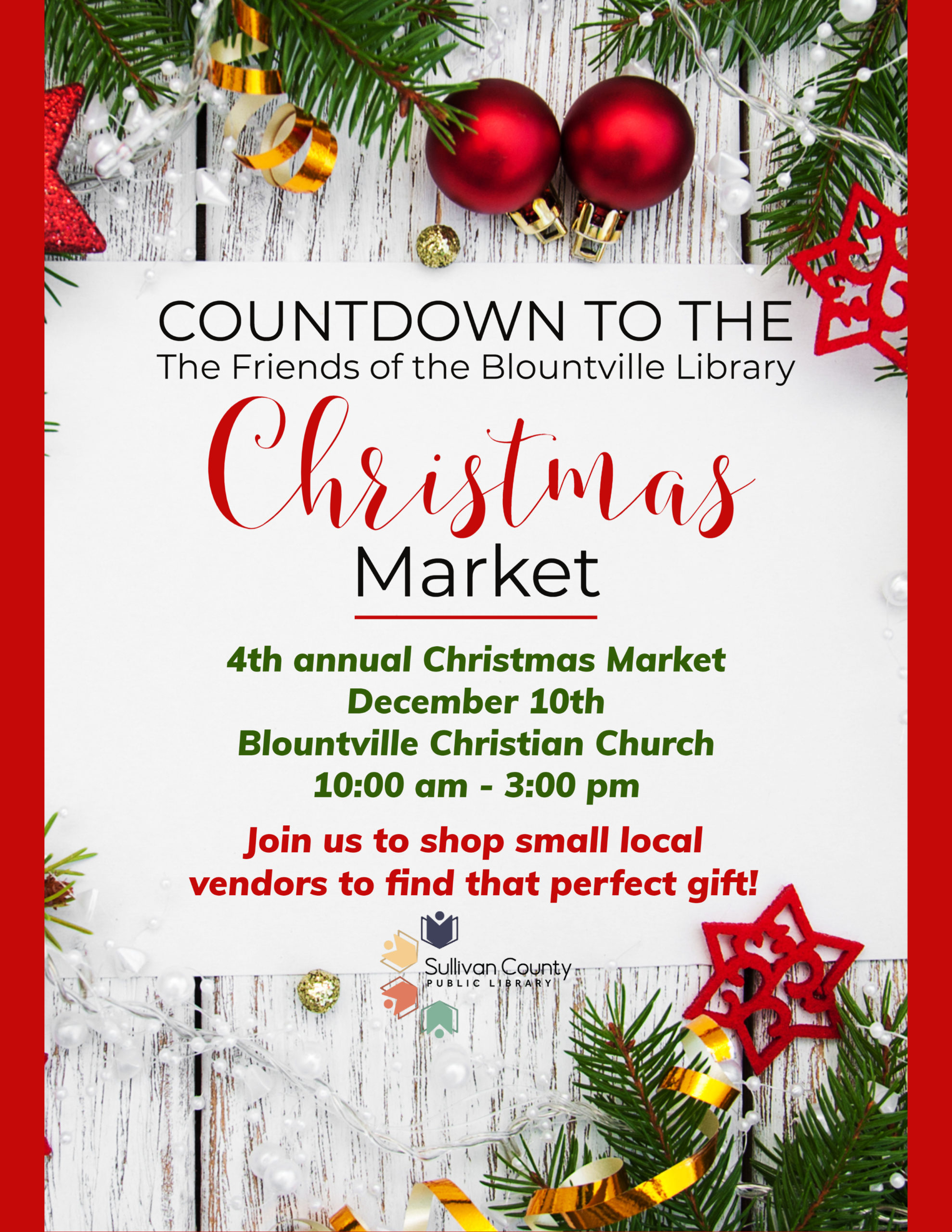 Historic Blountville 3397 TN-126, Blountville, TN, United StatesThe 4th annual Christmas Market is brought to you from The Friends of the Blountville Library, Sullivan County Public Library. This event is on December 10th from 10:00 am - 3:00 pm at the Blountville Christian Church. Crafts and handmade gifts you can get from local vendors.