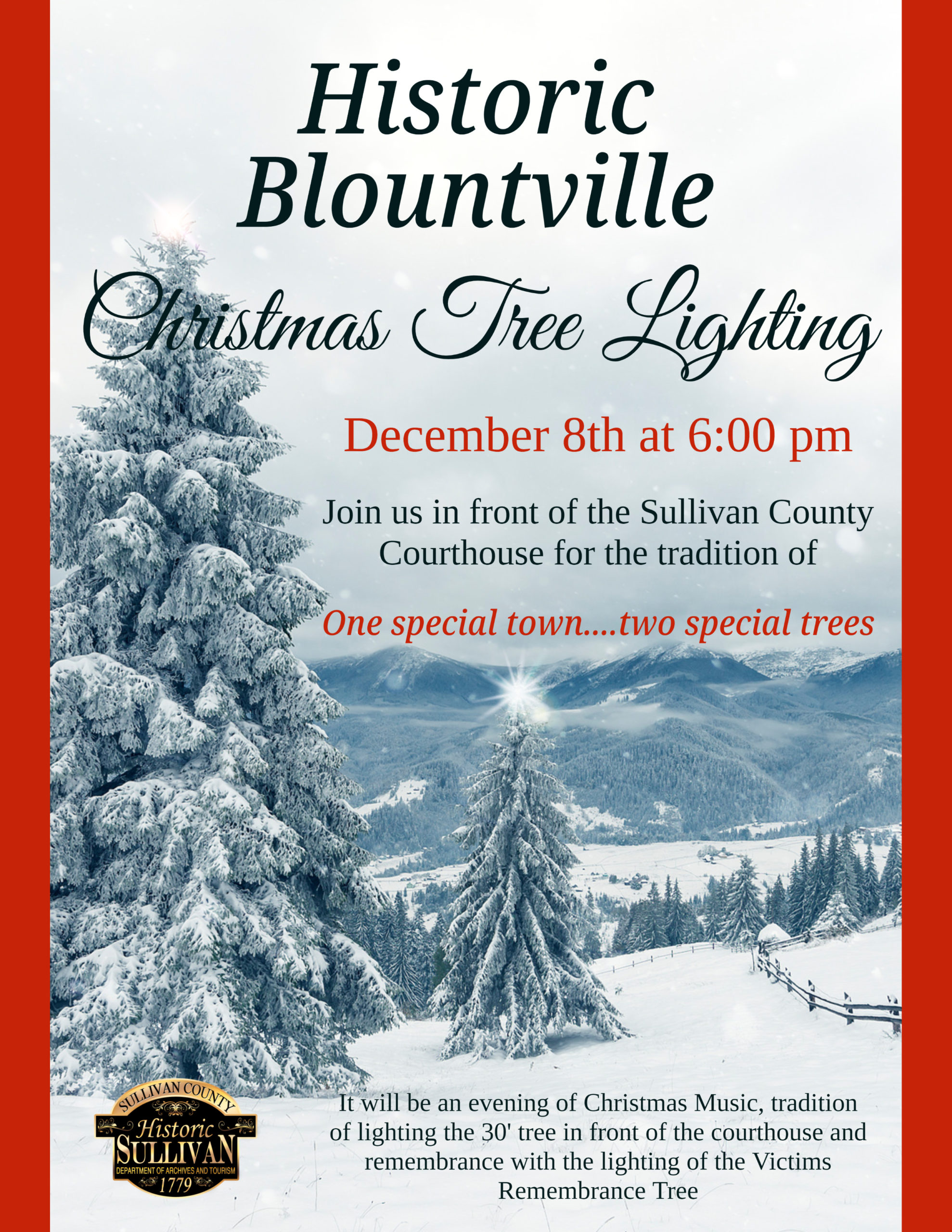 Historic Blountville 3397 TN-126, Blountville, TN, United StatesHistoric Blountville Tree Lighting Blountville, Tennessee – Historic Blountville will be holding its annual Christmas Tree Lighting on December 1st at 6:00pm. The backdrop of this picturesque event will be the Historic Sullivan County Courthouse. The theme, “One Special Town…Two Special Trees.” The Traditional Christmas Tree is a massive 50’ tree located on the courthouse lawn and will