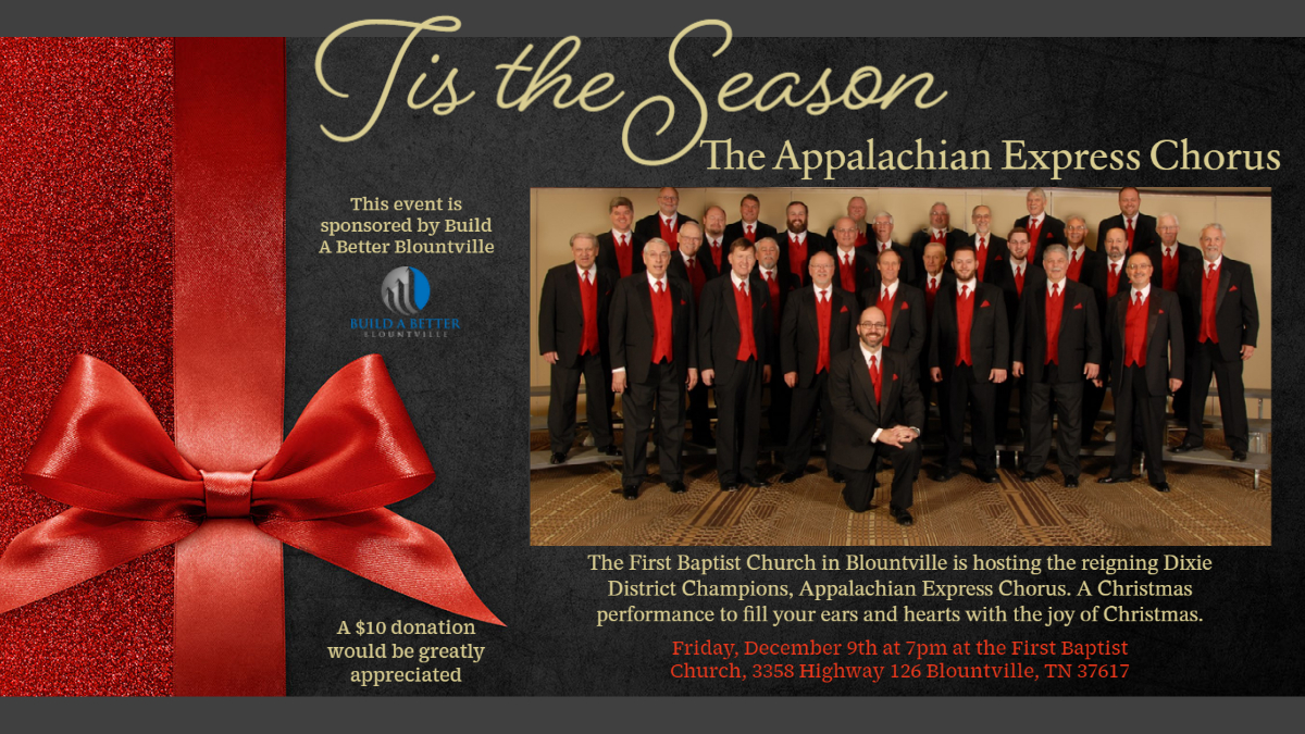 Historic Blountville 3397 TN-126, Blountville, TN, United StatesDecember 9th at 7:00 pm, enjoy the sounds of the Season from the very talented, The Appalachian Express Chorus! This event is sponsored by Build A Better Blountville and held at the First Baptist Church in Historic Blountville, TN.