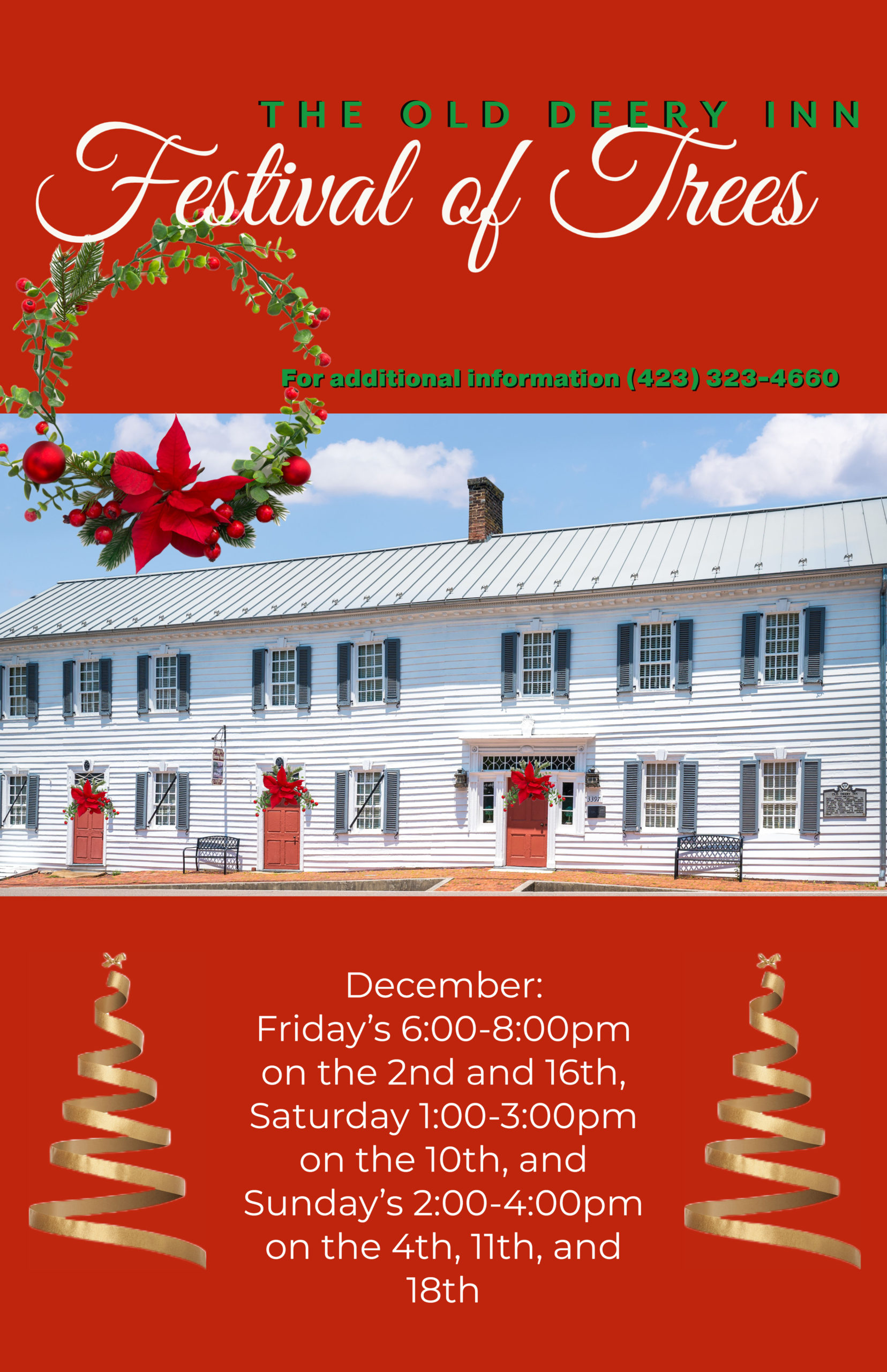 Historic Blountville 3397 TN-126, Blountville, TN, United StatesThe Blountville Historic Preservation Association is wanting you to come and see the beautiful display of Christmas trees inside the historic Deery Inn. Businesses and Organizations have uniquely decorated trees in the setting of this lovely, nearly 200-year-old Inn. Friday's 6:00 pm to 8:00 pm on December 2nd and 16th. Saturday, December 10th 1:00 pm-