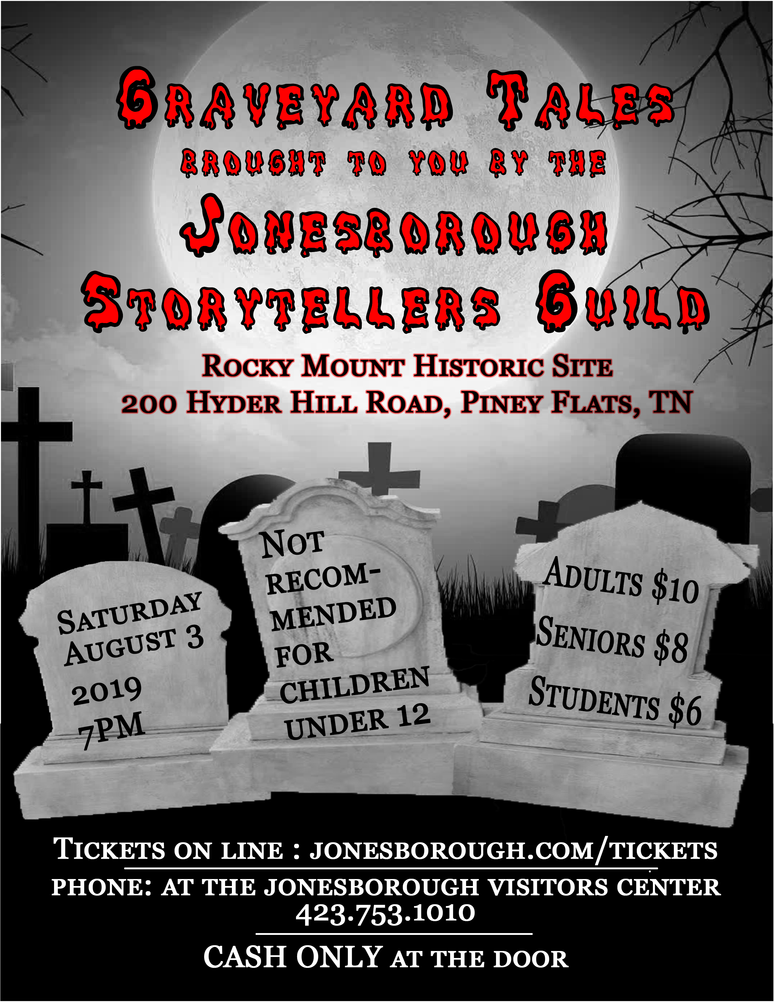 Rocky Mount State Historic Site 200 Hyder Hill Rd., Piney Flats, TN, United StatesGraveyard Tales Returns to Rocky Mount on August 3 Real? Imagined? Who knows? Creepy tales unfold from within the graveyards of Jonesborough, famous for its storytellers and ghosts, with the Jonesborough Storytellers Guild on Aug. 3 at 7 p.m. at Rocky Mount State Historic Site. The Guild is the oldest continuing group of